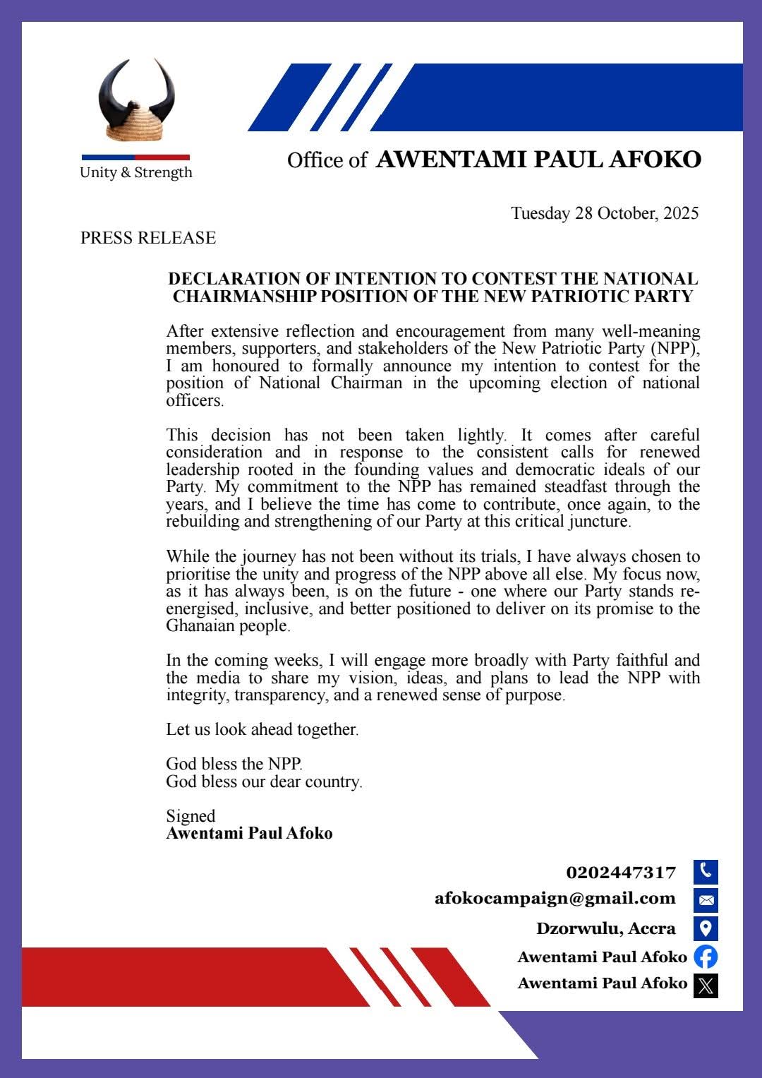 In a statement titled “Declaration of Intention to Contest the National Chairmanship Position of the New Patriotic Party,” Mr. Afoko said his decision follows extensive reflection and encouragement from party members and stakeholders who are calling for renewed leadership within the NPP.