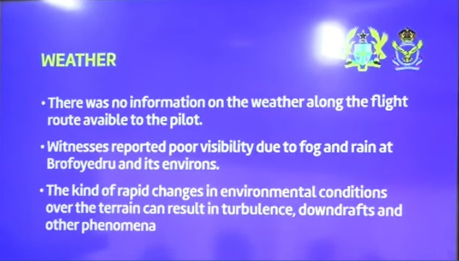 The investigative committee, chaired by Acting Minister for Defence Dr. Cassiel Ato Forson, was tasked with establishing the cause of the crash and recommending measures to prevent future incidents. Its report concluded that the helicopter went down after a sudden loss of altitude and lift caused by a downdraft over high terrain.
