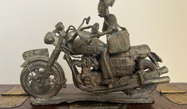 Among Waterfield’s notable contributions is a famous brass self-portrait of Timothy Garrard on his motorbike in Kumasi, sculpted in 1980 by Yaw Amankwa.