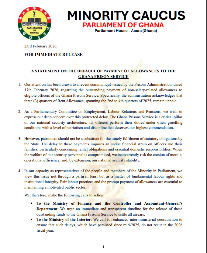 In a statement issued on Monday, February 23, 2026, and signed by Deputy Ranking Member of the Committee on Employment, Labour Relations and Pensions, Frank Asiedu Bekoe, the Caucus said it had taken note of a recent communiqué from the Prisons Administration confirming that three-quarters of Rent Allowance, covering the second to fourth quarters of 2025, remain unpaid.