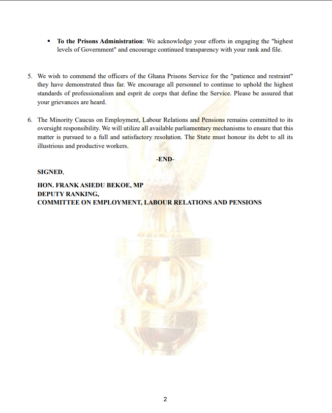 The Caucus commended personnel of the Ghana Prisons Service for what it described as patience and restraint, urging them to maintain professionalism as efforts are made to resolve the issue.