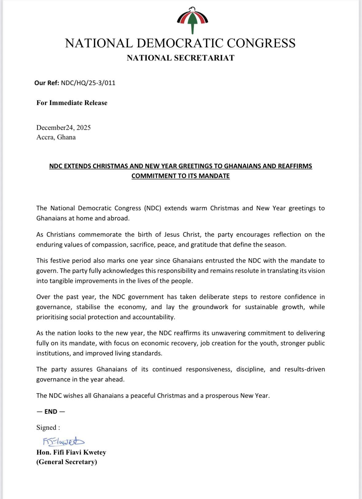 In a statement issued by the party’s National Secretariat on Wednesday, December 24, 2025, and signed by the General Secretary, Fifi Fiavi Kwetey, the NDC acknowledged the responsibility entrusted to it by the people of Ghana and reaffirmed its commitment to delivering on its mandate.